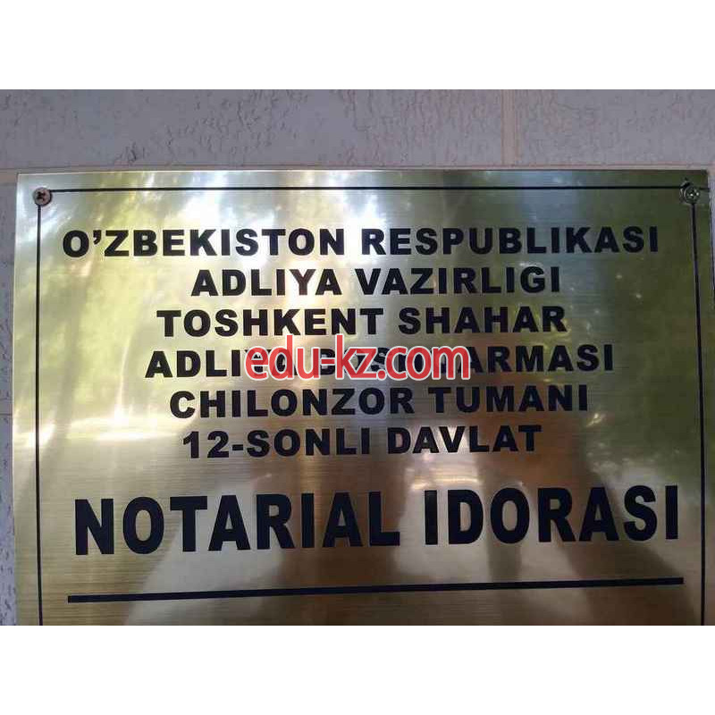 Юридические услуги, оказываемые нотариусом Нотариусы - O'zbekiston respublikasi adliya vazirligi Toshkent shahar adliya boshqarmasi chilonzor tumani 12-sonli davlat notarial idorasi - очень востребованная сфера услуг. Каждый день огромное количество людей работает с огромным количеством документов. Без нотариуса, квалифицированного специалиста Нотариусы - O'zbekiston respublikasi adliya vazirligi Toshkent shahar adliya boshqarmasi chilonzor tumani 12-sonli davlat notarial idorasi, в таких условиях никуда. Обращайтесь в Нотариусы - O'zbekiston respublikasi adliya vazirligi Toshkent shahar adliya boshqarmasi chilonzor tumani 12-sonli davlat notarial idorasi за услугами нотариуса в городе %E%.
